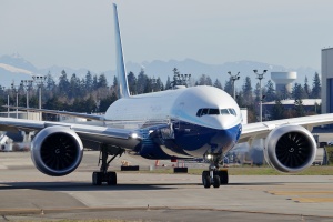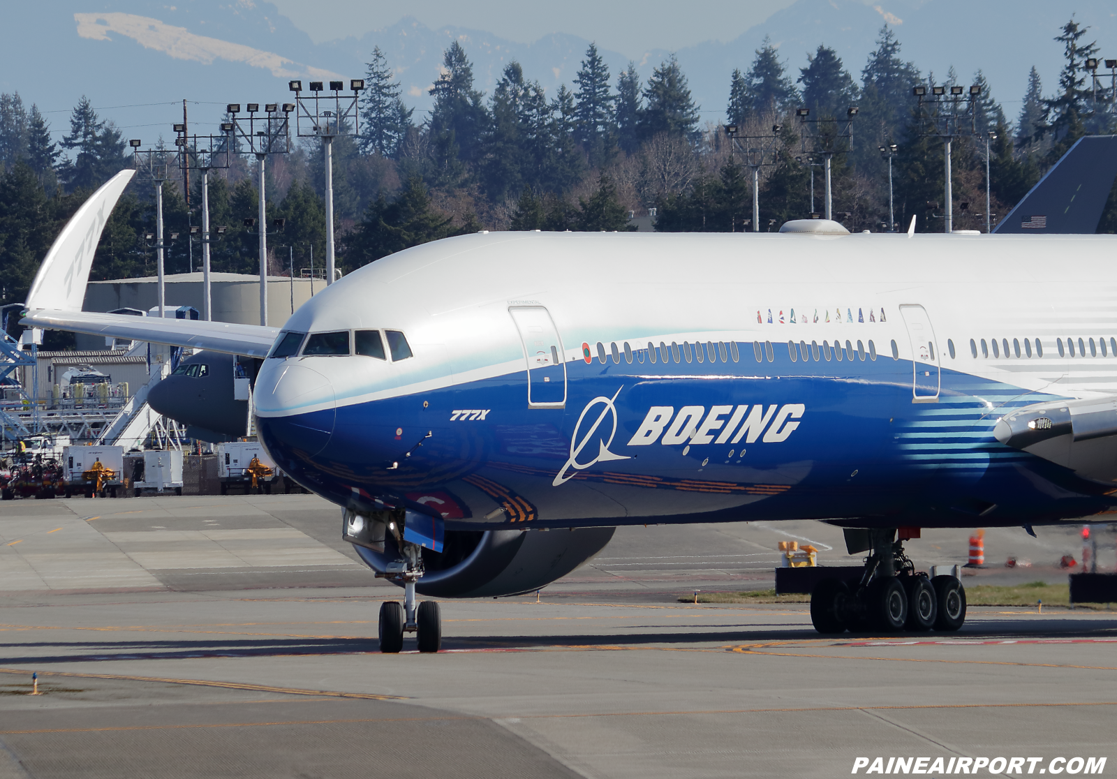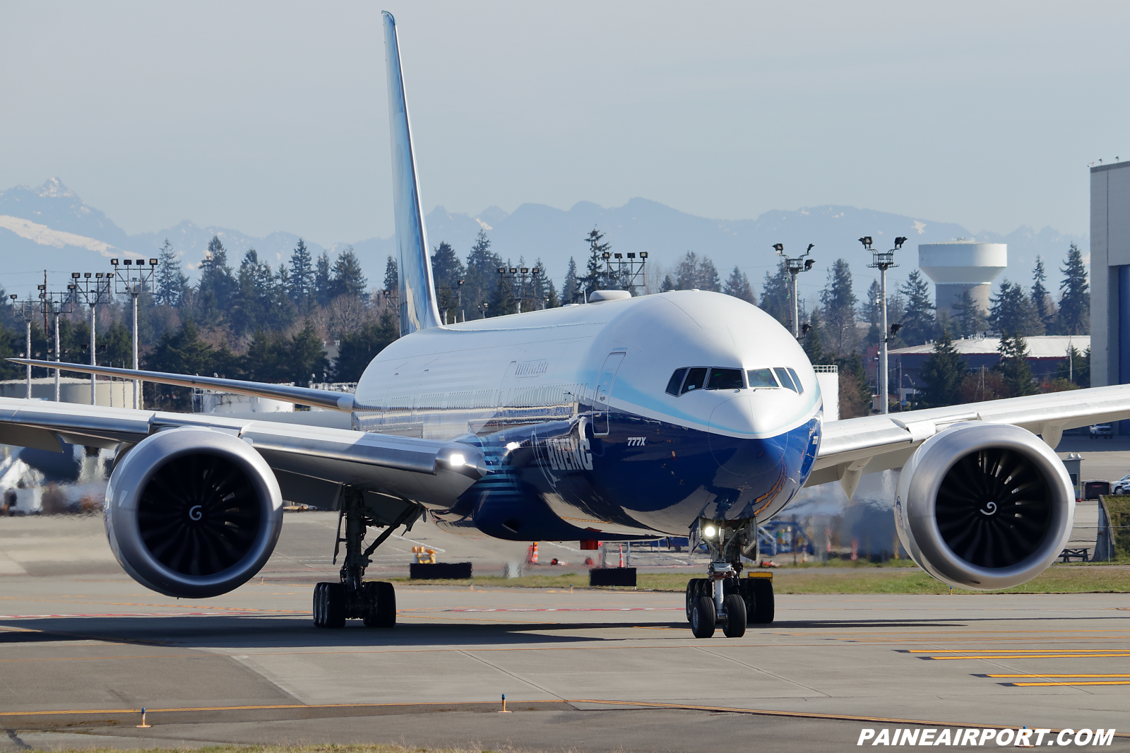 WH001 777-9 N779XW departing for autobrake testing. Scheduled for steering